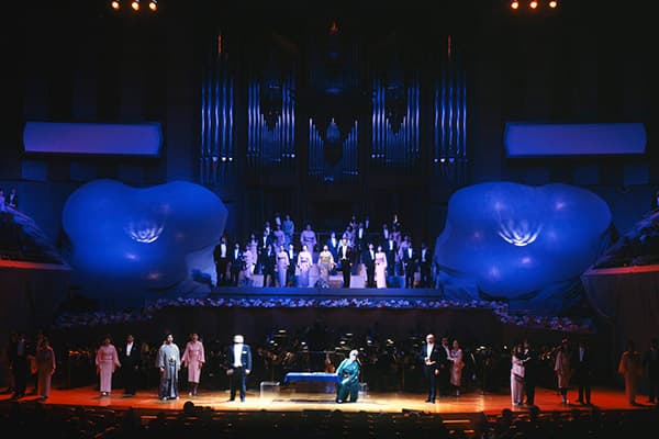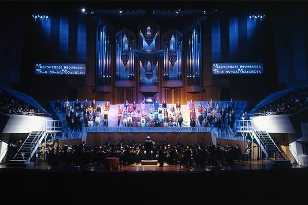 A new way of staging operas devised by Suntory Hall. The staging, sets and lighting make full use of the space and acoustics of the hall, where the stage is fully surrounded by the audience and the orchestra and the singers perform on the same stage.