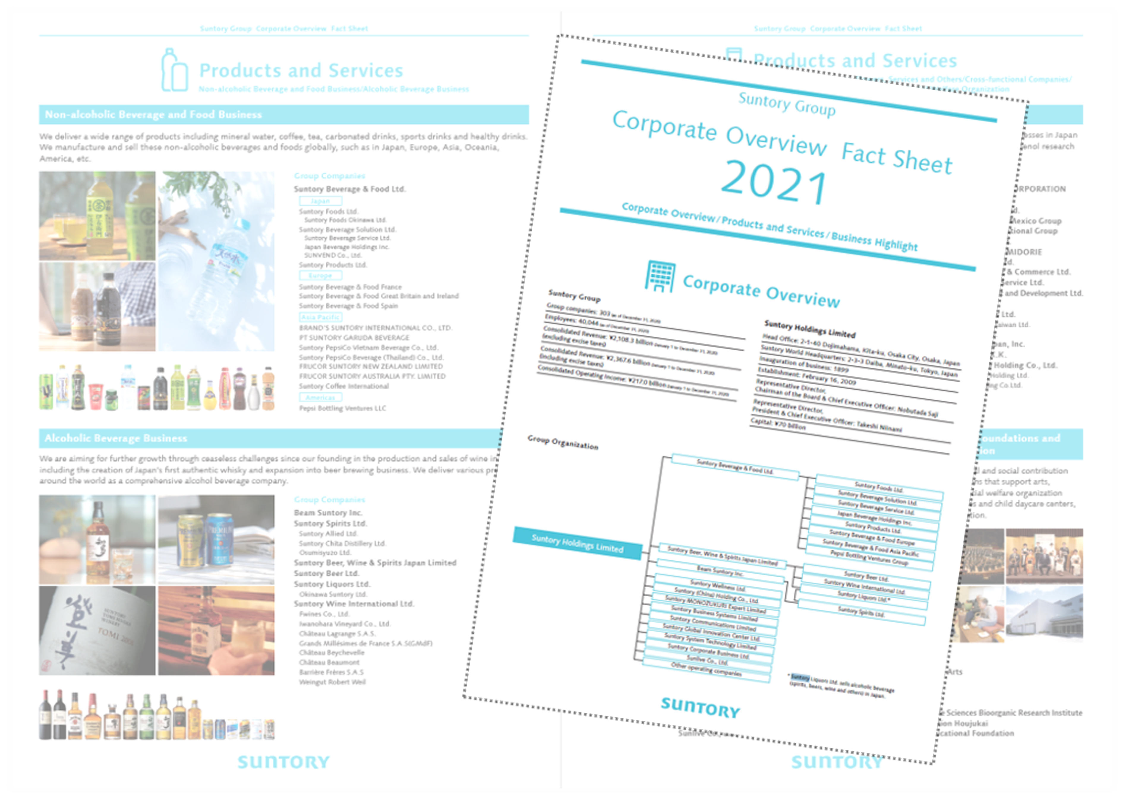 The copyrights of all Materials (including but not limited to images, videos, and copy) in this newsroom belong to Suntory. The Materials are to be used for personal and noncommercial use only. Use of the Materials for advertising, marketing or any other commercial purpose is prohibited.