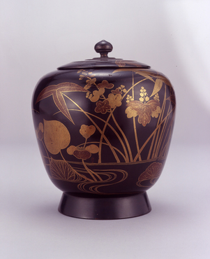 Freshwater container with threeleaf arrowhead and hollyhock design in maki-e