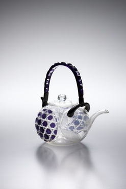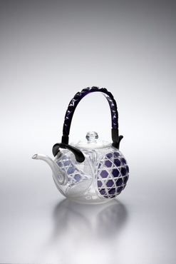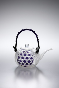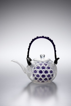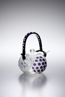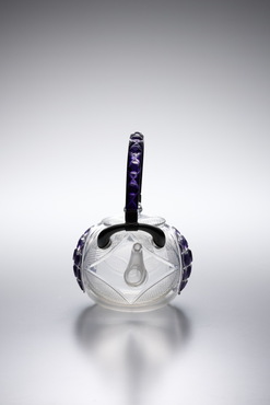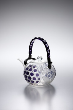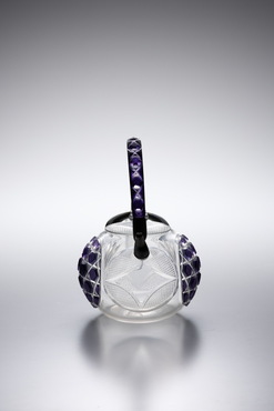 Circular shapes of blue-tinged purple glass are fused to both sides of the spherical body. The colored circle has a hexagonal wickerwork pattern, which is also used on the handle. The lid and the colorless part of the body are cut in the shippo-tsunagi pattern ( interlocking circles ). The handle is fixed to the tin-covered glass fittings which are fused to the body at three points. Being the only wine ewer of Satsuma cut glass in existence, this is an extremely valuable piece.