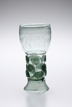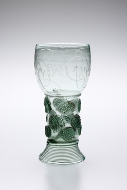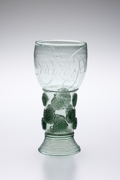Römer, a grass for white wine, was produced in the Rheinland in Germany, at Delft in the Netherlands, and in Normandy in France. The pale green bowl is delicately blown, and decorated with the expression "Ein Glasje von welkomst" (the wine glass of welcome) done in diamond-point engraving. The stem is decorated with circular glass pieces having beaded, raspberry-like protrusions. The foot is formed by strands of spiral glass. The shape is typical of Römer glass produced in the 17th century.
