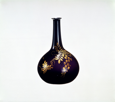 In the Edo period, painting on glass was usually achieved not through enameling, which requires that the enamels be fired to fix them, but an application of the maki-e technique, in which the pigments are attached to the glass with urushi lacquer. Most such designs are simple; the sophisticated maki-e created with delicate brushwork seen on this bottle is rare. The wisteria blossoms are elegantly dangling in three clusters. A record states that purple glass was first blown in Edo by the glassmaker Man'emon in the Hōreki era (1751-1764). The box for this bottle carries the ink inscription "1825 (Bunsei 8), 10th month, Hayashi."