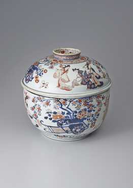 Covered Bowl with Beauties and Flower Cart Design in Overglaze Enamels