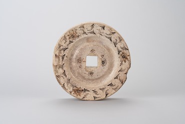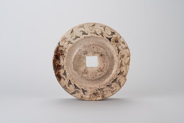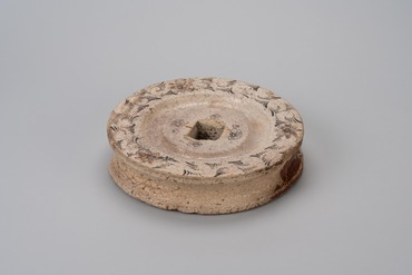 This Oribe-style well pulley from the latter half of the Edo period has a square hole at the center through which the axle would pass and a broad gutter around it. The surrounding area has arabesques with floral motifs on three sides in underglaze iron oxide; plum blossom motifs are scattered around the axle hole. The clay body is white with considerable inclusions of rough feldspar fragments. A transparent glaze has been applied to the entire surface. (Paragon or Puzzle? Your Own Perspectives on Works in the Suntory Museum of Art Collection, 2024)