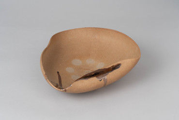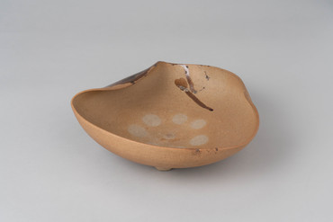 The bowl has been bent inward on two sides and three small feet attached at the bottom. Its inside has a flora; motif consisting of seven circles arranged around a large circle, and brown glaze has been poured on the bent sides. The bent sides and the floral motif in reserved white are modeled on Bizen ware, but this bowl is by Nonomura Ninsei, who made a great success of Kyōyaki, Kyoto ceramics, doing away with the massiveness of the Bizen style to create a gracefully refined work. (Paragon or Puzzle? Your Own Perspectives on Works in the Suntory Museum of Art Collection, 2024)