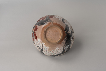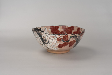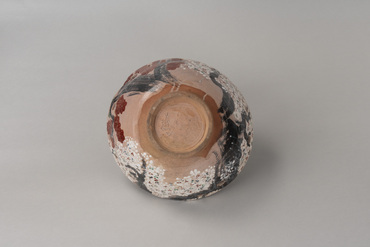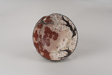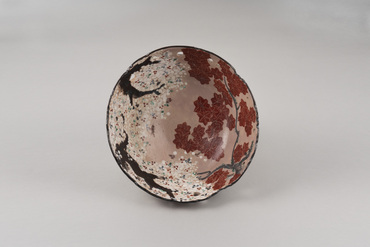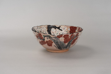 This thickly potted large bowl has non-uniform contours applied at its rim. In the interior and exterior are images of a cherry tree in full bloom and a maple tree's autumn foliage facing each other. The irregular openwork near the rim gives the cherry and maple trees a three-dimensional feel. Part of the foot cracked in firing. The body has a translucent glaze over the colored pigments, except at the foot and very bottom of the body. A large inscription, "Dōhachi," is carved into the inside of the foot. The red clay ground is visible in the unglazed areas. This combination of maple and cherry motifs, known as unkin-de, was the forte of Nin'nami Dōhachi, a great Kyō-yaki (Kyoto-ware) potter in the late Edo Period.