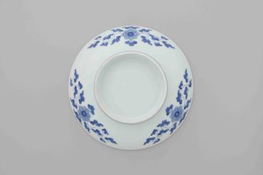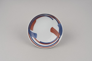 On the circumference of the inside of the dish, a clever design of four braided cords with tassels are painted in red and cobalt blue. The intersection of the cords is varied to avoid an otherwise monotonous design. The tips of the tassels turn inward, accentuating the white blank area in the center. The lines look sleek and the colors are bright. The tips of the tassels are painted in a pointillist manner. On the back of the bowl, shippo-tsunagi design ( interlocking circles ) appears in three places on the circumference. The foot is decorated with a comb-teeth motif.
