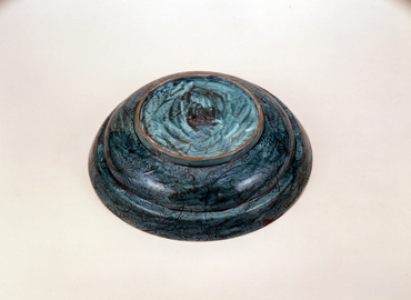 The inside of this shallow bowl has two banana leaves drawn in yellow and purple overglaze enamels. The remaining space is a green area filled with a somewhat distorted wave pattern. The outer rim has a fine arabesque pattern as a yellow ground. The underside is entirely in a green glaze, with chrysanthemum arabesques. Ko-kutani wares with green and yellow as their base colors are called aode. (Paragon or Puzzle? Your Own Perspectives on Works in the Suntory Museum of Art Collection, 2024)