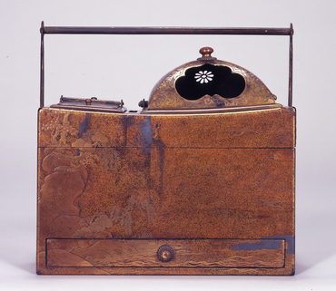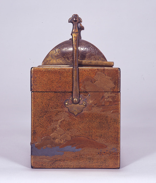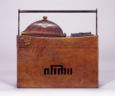 This smoking set is shaped like an incense pillow, used to scent the hair while sleeping. A hiire, a container for lit charcoal, is on the right and an ash receptacle on the left. When the handle is turned down towards the front, it serves as a kiseru holder. A landscape painting continues around all sides, and vents in the geometric form of the Genjikō incense game have been opened on the back.(Paragon or Puzzle? Your Own Perspectives on Works in the Suntory Museum of Art Collection, 2024)