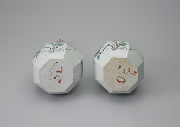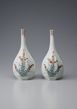 Pair of Vases with Chrysanthemums and Bellflowers Design in Overglaze Enamels