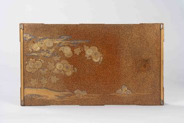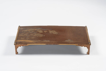 Originally, the low desk was used to hold paper for writing poetry. Finished in nashi-ji pear-skin decoration, the top panel depicts chrysanthemums growing on mounds of earth. The flowers are rendered in burnished togidashi maki-e and low relief takamaki-e with pieces of cut gold and silver (kirikane) and kanagai metal inlays. Kirikane is also added to the petals, which are drawn in fine lines of lacquer followed by a sprinkling of gold powder (tsukegaki). The four corners of the top panel and the gold and copper fittings on the long side feature halved chrysanthemum patterns that complement the formal chrysanthemum motif. The sparse composition, which uses raised maki-e, kirikane, kanagai, and other techniques, while leaving half of the panel blank is characteristic of the Muromachi period. The object is valuable as an example of an early low desk.