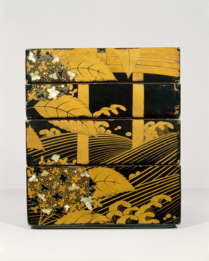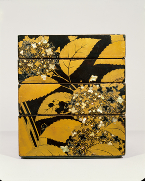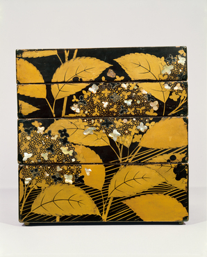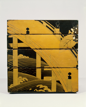 A single scene of hydrangea and an arched bridge across rapids is depicted on all four sides of the box in hiramaki-e gold work on black lacquer. The hydrangea also fans out on top of the lid. The continuity, the composition that appears to project from the surface, and the fast-flowing stream depicted with lines of differing thickness and spacing create an extremely dynamic and lively impression. In addition to the kakiwari technique, reserving black lines against the maki-e areas, and harigaki engraving, reddish gold dust has been used to create three-dimensional effects in the leaf veins and the lines of the bridge. The flowers of the hydrangea are accented with mother-of pearl inlays.