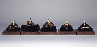 Emperor: H. 16.5/ Empress: H. 19.0(including crown)/ Five musicians: (Chanter) H. 11.4, (Player of Japanese flute) H. 11.0, (Player of shoulder drum) H. 15.5(including headgear), (Player of slide hand drum) H. 13.5, (Player of stick drum) H. 11.0/ Minister: (Left) H. 17.7, (Right) H. 18.2