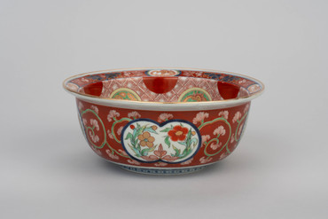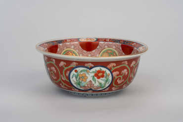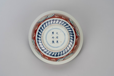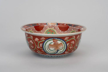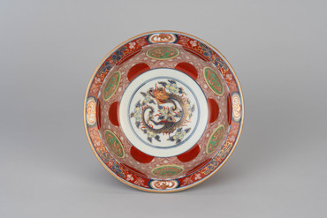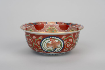 This large, heavily potted bowl has a flanged rim. The Chinese-style dragon and clouds motif on the interior of the bowl is painted in underglaze blue and overglaze red, yellow, and gold. Around it are six roundels in which coiled dragon and sacred jewel motifs in red and gold on a bright green ground alternate. The space around them is filled with chrysanthemum lozenge motifs. The outside is surrounded by arabesques on the red ground; within panels on the four sides, phoenix and floral motifs alternate. Inside the foot is the inscription Daimin banreki nen sei (""made in the Wanli era, Ming dynasty"") inside two concentric circles; there are also five kiln spur marks. Ko-Imari style wares such as this bowl were modeled on late Ming kinrande (overglaze enamel with gold) or wucai wares, and produced for the domestic market.