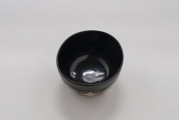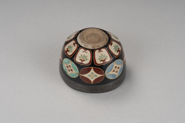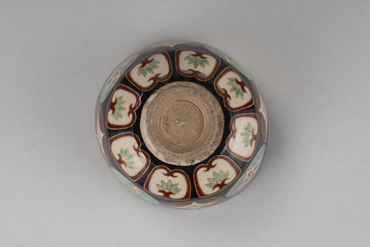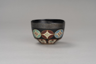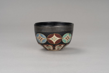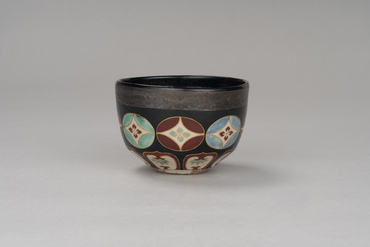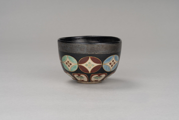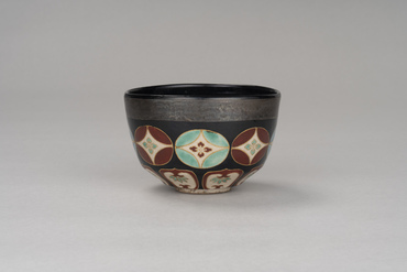 This tea bowl begins with a slightly curving walls, followed by beveling that pulls it in from the waist to the foot. A wide band of silver circles the outside of the rim. Below it are eight floral shippō-tsunagi (interlocking circles) in red, blue, and green, followed by eight lotus petal motifs. The shippō-tsunagi and lotus petals are painted in colored pigments on a white glazed ground and edged in gold pigment. The inside of the foot has the oval "Ninsei" seal applied to it. Nonomura Ninsei, under the guidance of tea master Kanamori Sōwa, created copies of Chinese, Seto, and Korean tea bowls while also making a great success of overglaze enamelled ceramics.