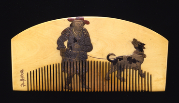 Ivory comb with European style persons design in maki-e, with inscription of Shoka-sai
