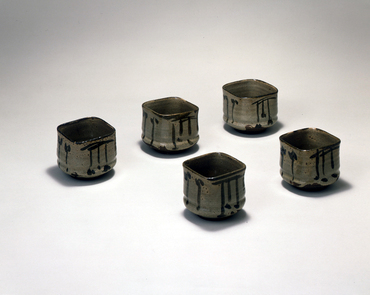These bowls were first thrown in cylindrical shapes on a wheel and then the rims shaped by hand to create squarish forms. The waist is slightly restricted, and below it the bowl swells out like a round cushion. This seems to have been a popular shape for Karatsu pieces, and one can find many examples of it. On the body are alternating designs of what appear to be dried persimmon and plant sprouts. They are rendered quickly and concisely with bold and powerful brushstrokes, and the groupings of vertical lines create rhythmical designs. Thin glaze was applied to the body up to the area of the waist; the low foot was trimmed while the clay was still damp.