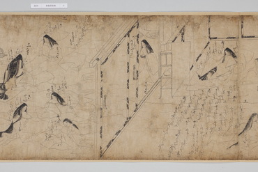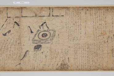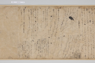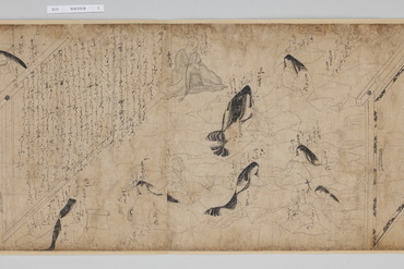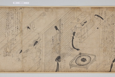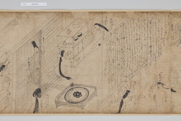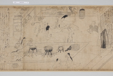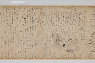 The monk Zenkyōbō visits the home of an aristocrat to explain the teachings of the Buddha. There are no explanatory notes. Instead, the story unfolds through dialog written alongside the characters in the picture. The servants are particularly recalcitrant and the sight of Zenkyōbō dealing with their retorts raises a laugh. The content is deeply religious, but the painting style is that of an approachable and simple ink drawing. There is a sense of reality about the depiction of the work of the servants and the interior of the home where the dialog unfolds. The scroll may have been intended to educate the common people, who would have felt some affinity with the scenes.