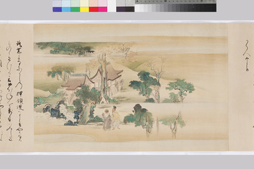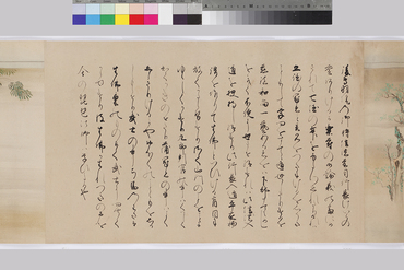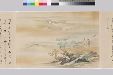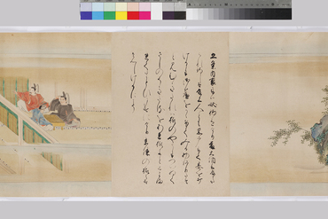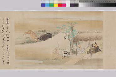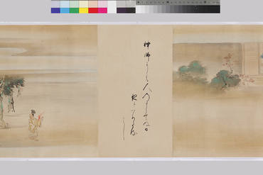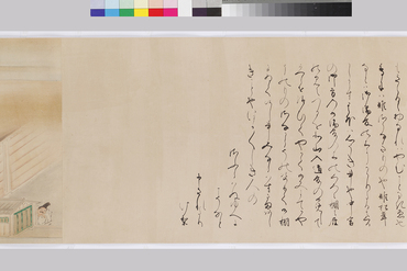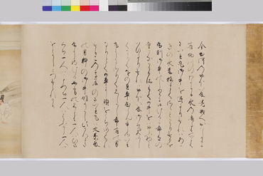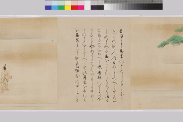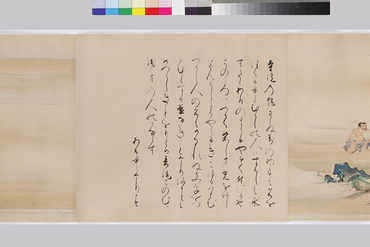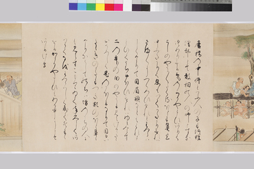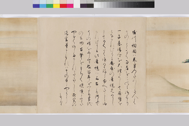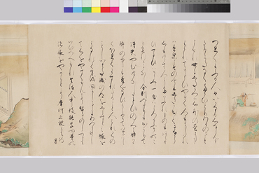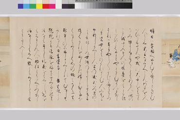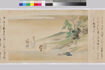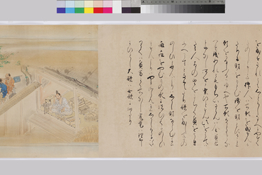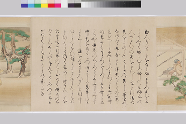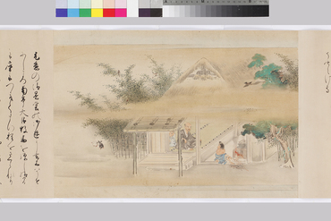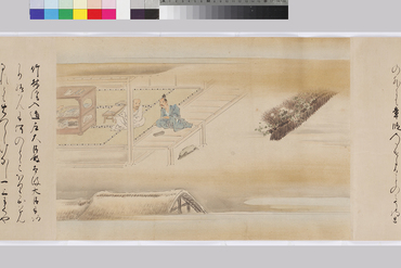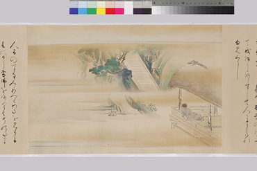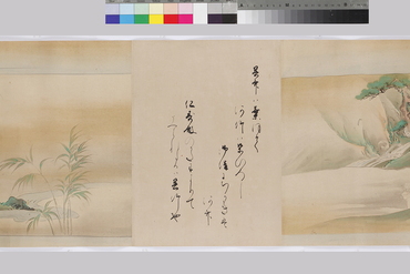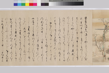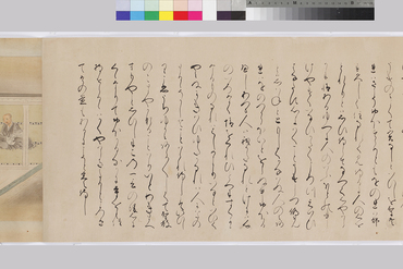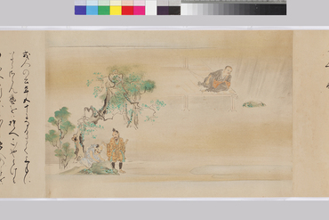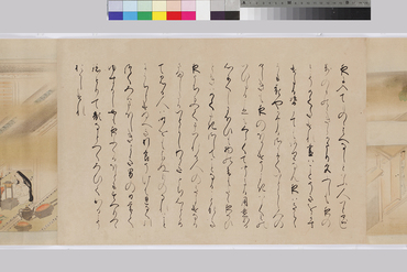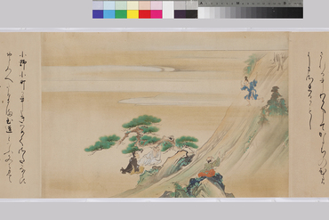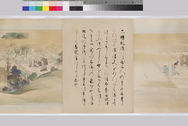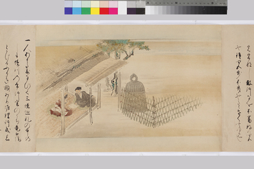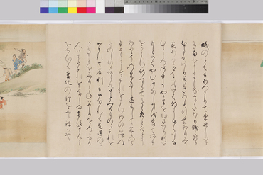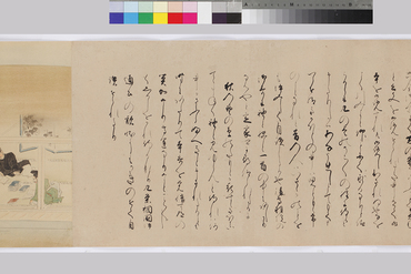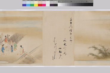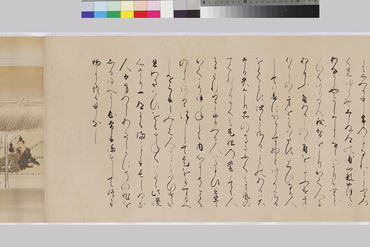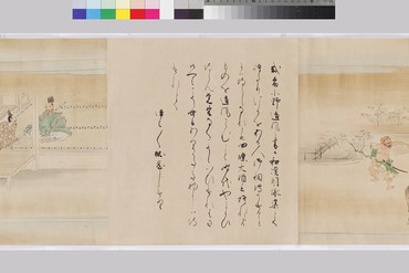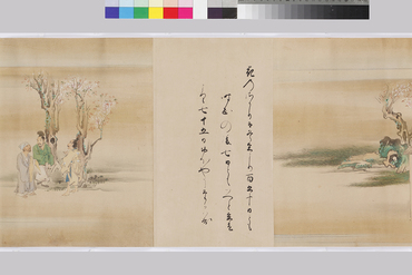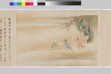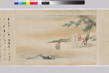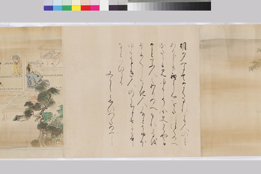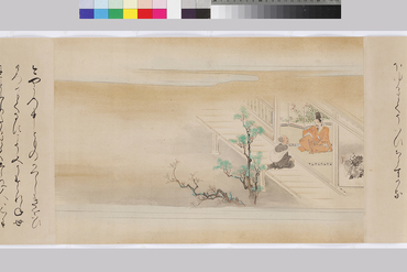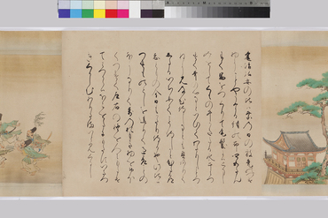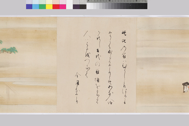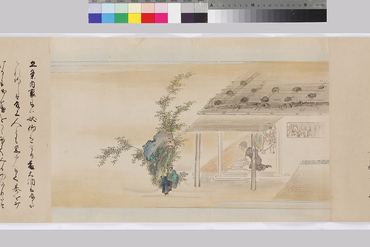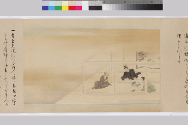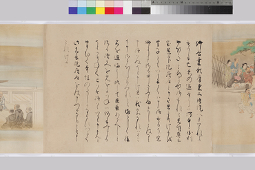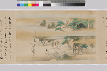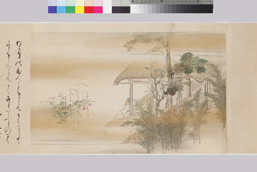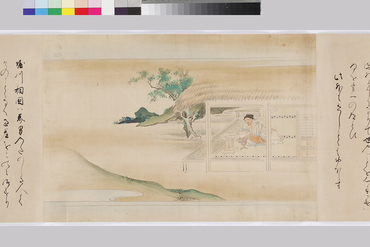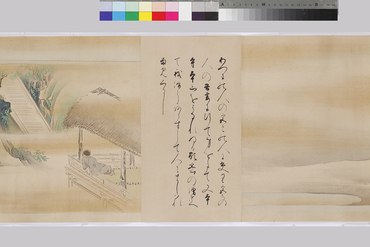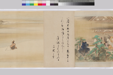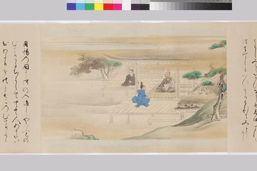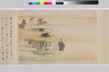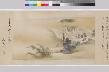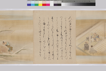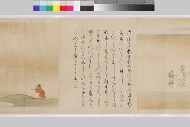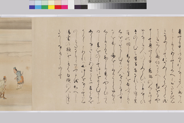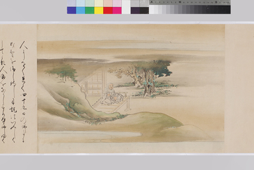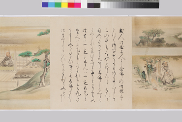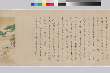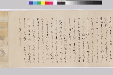 This is the only existing major picture scroll with explanatory notes for the whole text and illustrations for all chapters of the Tsurezuregusa (Essays in Idleness) written by the monk Kenkō. The esthetics of Kenkō are symbolically expressed in soft hues by Yūsetsu, the son of Kaihō Yūshō. Illustrations of the Tsurezuregusa, which was written in the Kamakura period, began to appear in the Edo period. The annotated and illustrated edition of the Nagusamigusa published around 1652 (Keian 5) is traditionally regarded as the first Tsurezure-e (Essays in Idleness painting). However, the chapter divisions in this picture scroll are consistent with an earlier printed book making it a valuable scroll that predates the publication of the Nagusamigusa.