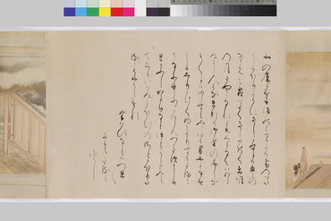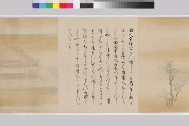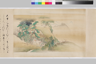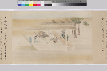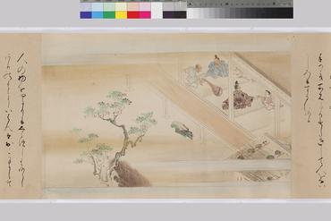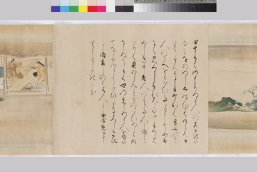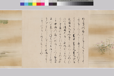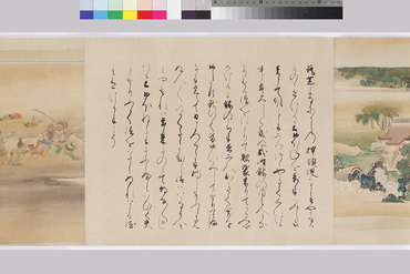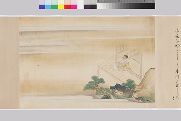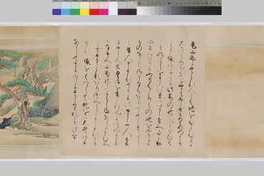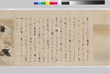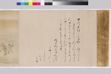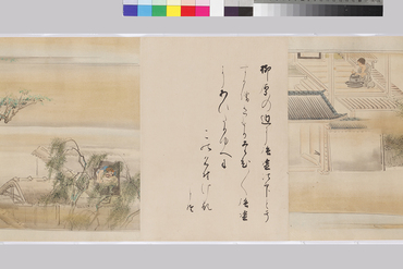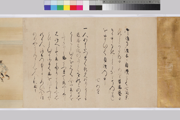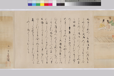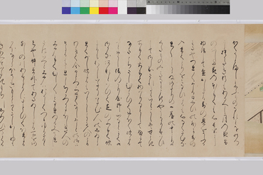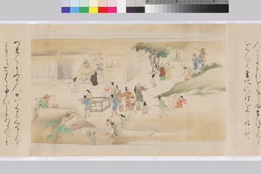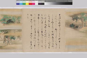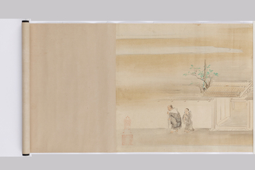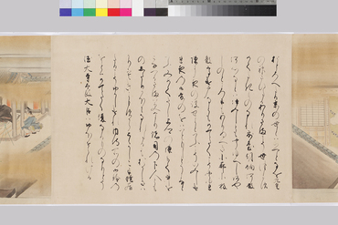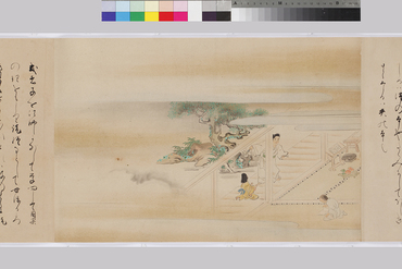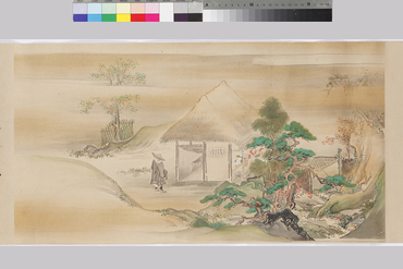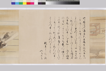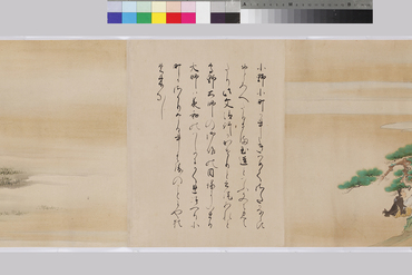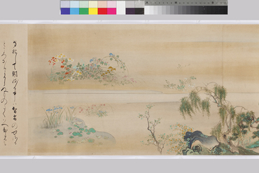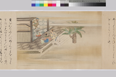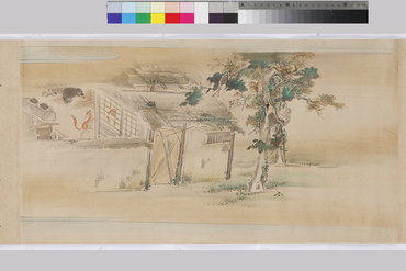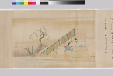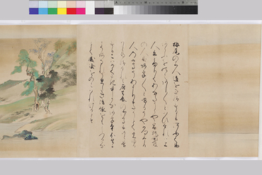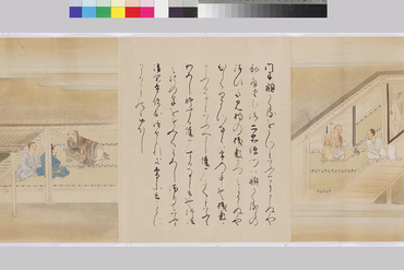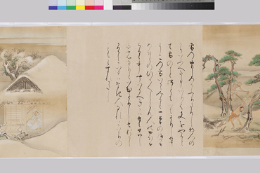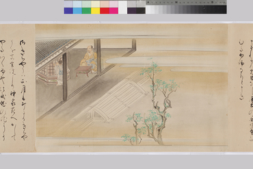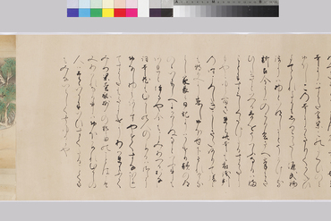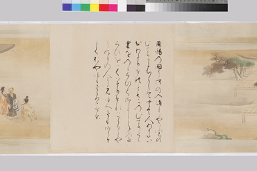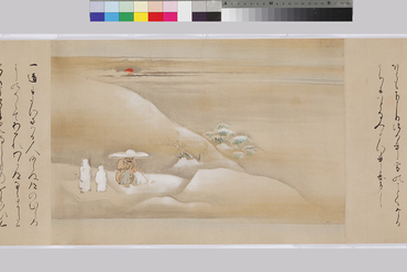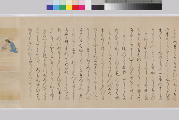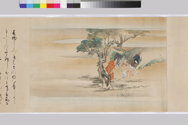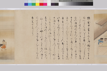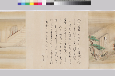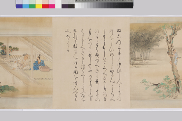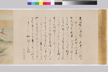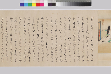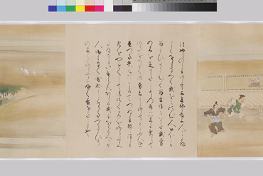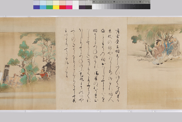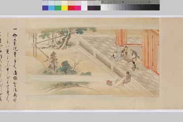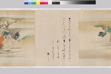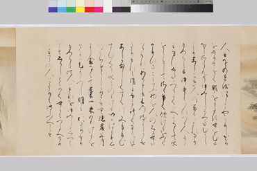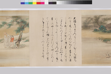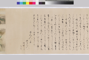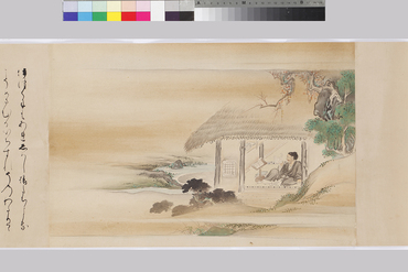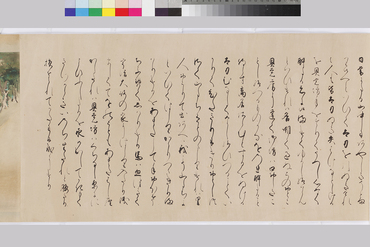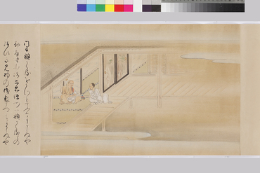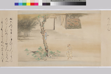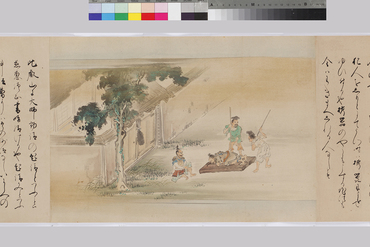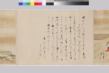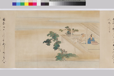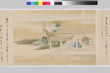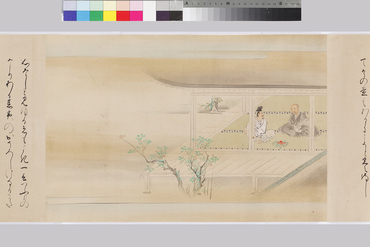 This is the only existing major picture scroll with explanatory notes for the whole text and illustrations for all chapters of the Tsurezuregusa (Essays in Idleness) written by the monk Kenkō. The esthetics of Kenkō are symbolically expressed in soft hues by Yūsetsu, the son of Kaihō Yūshō. Illustrations of the Tsurezuregusa, which was written in the Kamakura period, began to appear in the Edo period. The annotated and illustrated edition of the Nagusamigusa published around 1652 (Keian 5) is traditionally regarded as the first Tsurezure-e (Essays in Idleness painting). However, the chapter divisions in this picture scroll are consistent with an earlier printed book making it a valuable scroll that predates the publication of the Nagusamigusa.