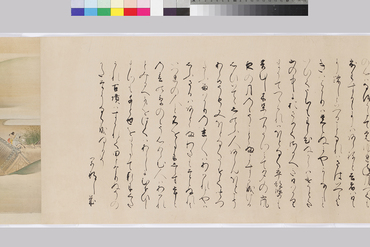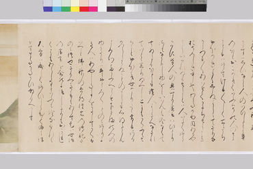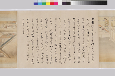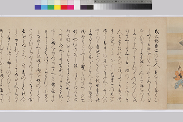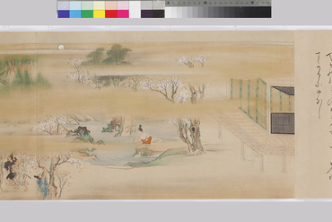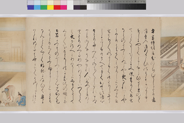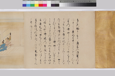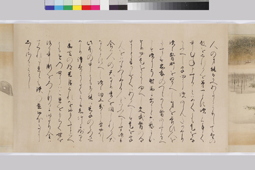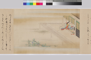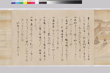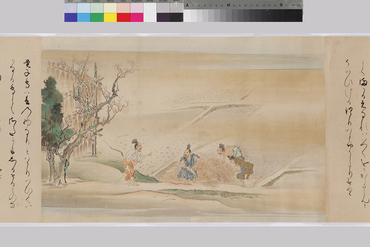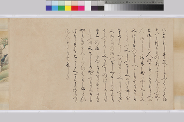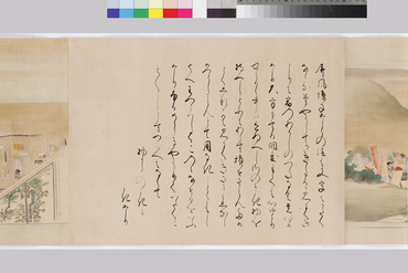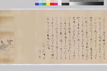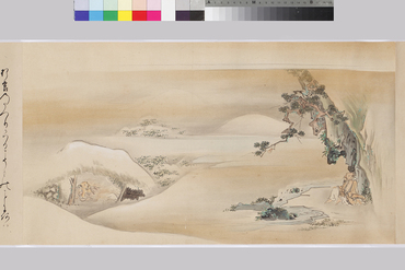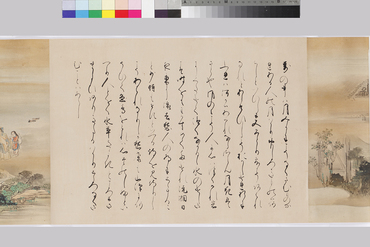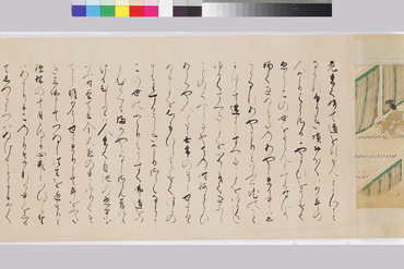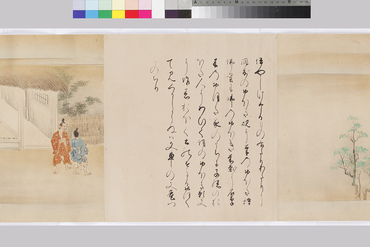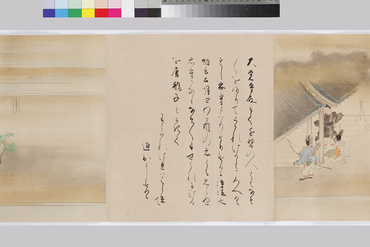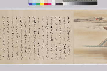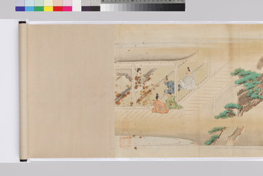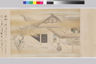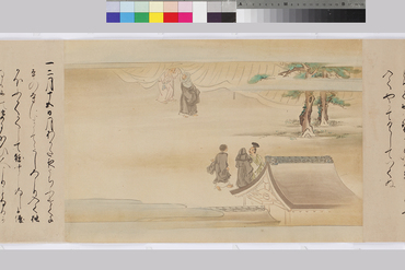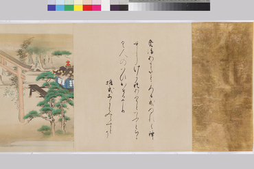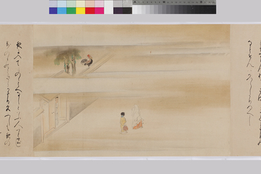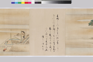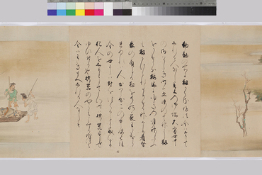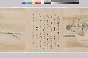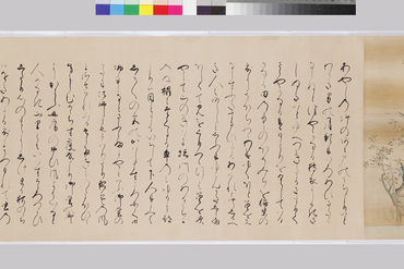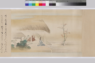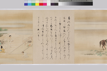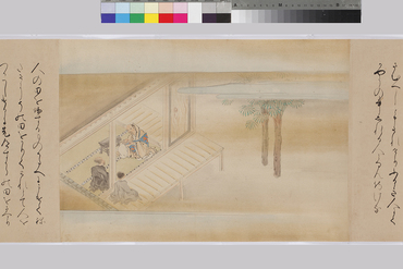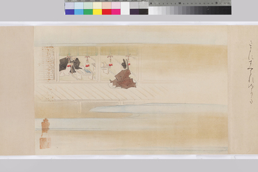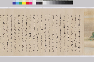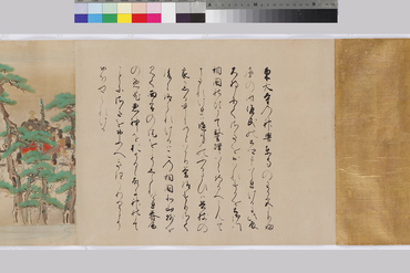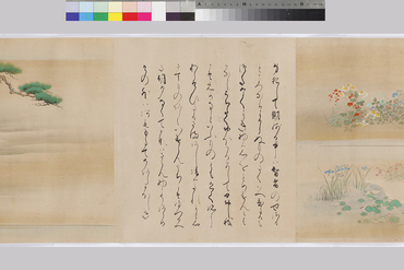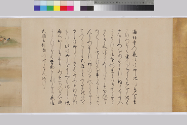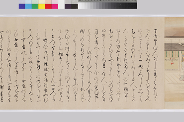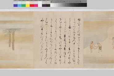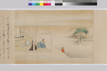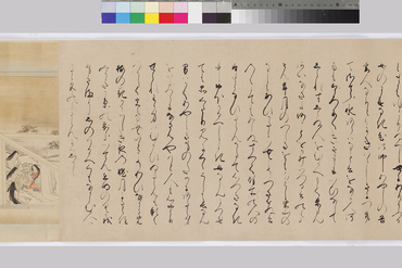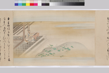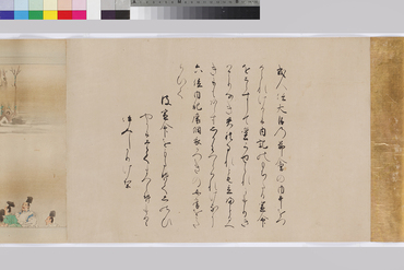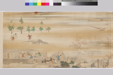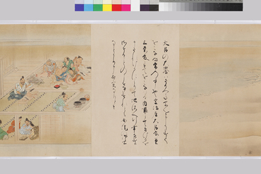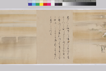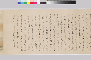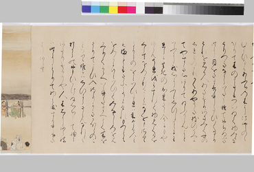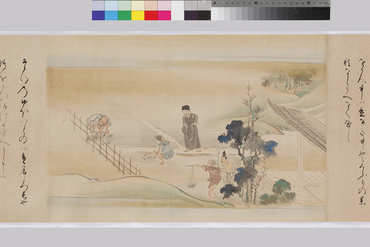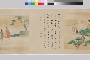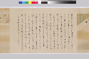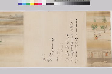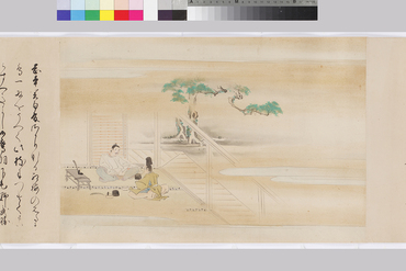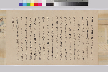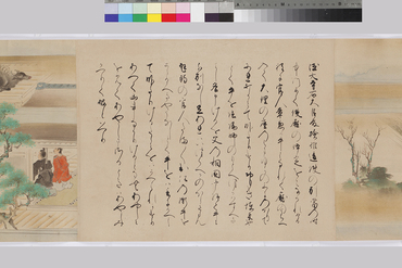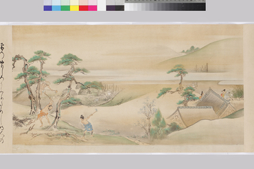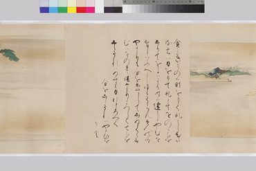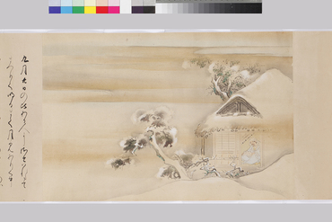 This is the only existing major picture scroll with explanatory notes for the whole text and illustrations for all chapters of the Tsurezuregusa (Essays in Idleness) written by the monk Kenkō. The esthetics of Kenkō are symbolically expressed in soft hues by Yūsetsu, the son of Kaihō Yūshō. Illustrations of the Tsurezuregusa, which was written in the Kamakura period, began to appear in the Edo period. The annotated and illustrated edition of the Nagusamigusa published around 1652 (Keian 5) is traditionally regarded as the first Tsurezure-e (Essays in Idleness painting). However, the chapter divisions in this picture scroll are consistent with an earlier printed book making it a valuable scroll that predates the publication of the Nagusamigusa.