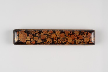 This long rectangular letter box has rounded corners and ridges, with the cover entirely eclipsing the box in kabuse-buta style. Metal fittings are attached to the side panels of the box through which cord was strung. The entire surface is coated with black lacquer. From the top to the sides of the cover, autumn flowers, such as Japanese bush clover and chrysanthemums are pictured. The decorative techniques employed are: flat maki-e, e-nashiji, and needle engraving. This is one of the most exquisite letter boxes of Kodaiji maki-e in the collection.