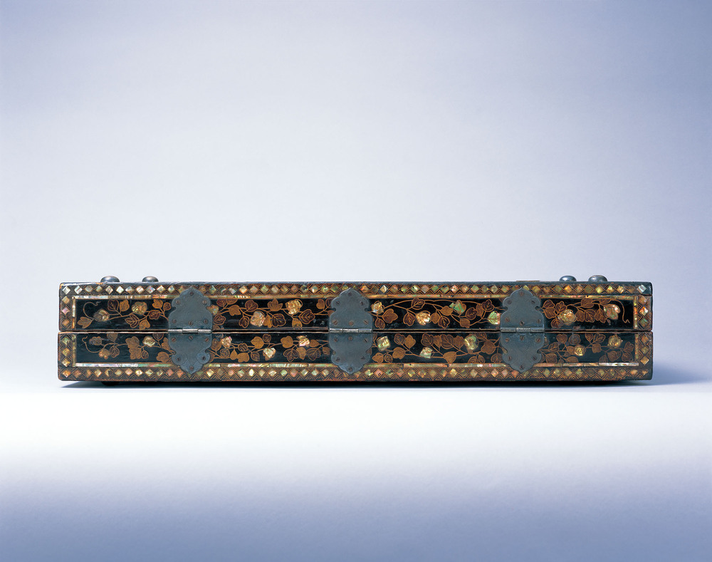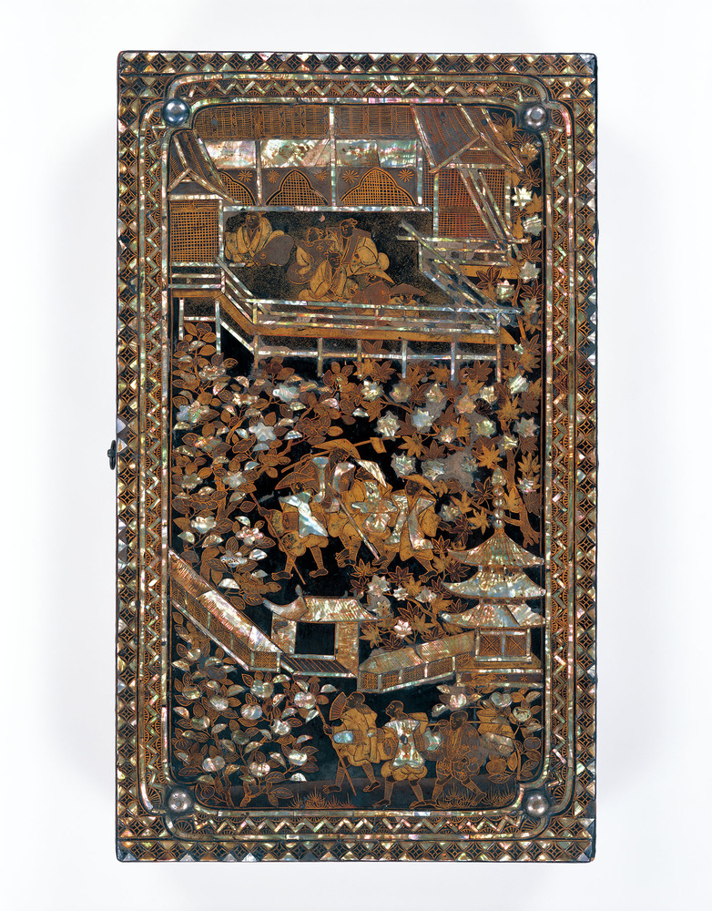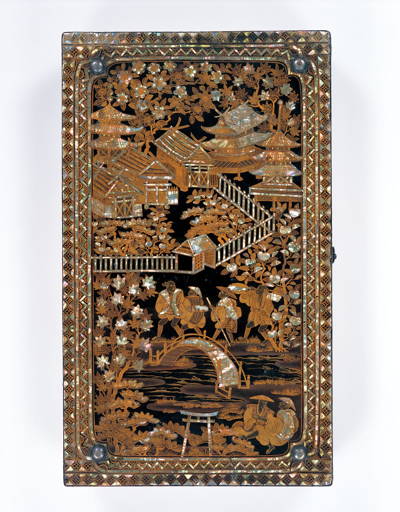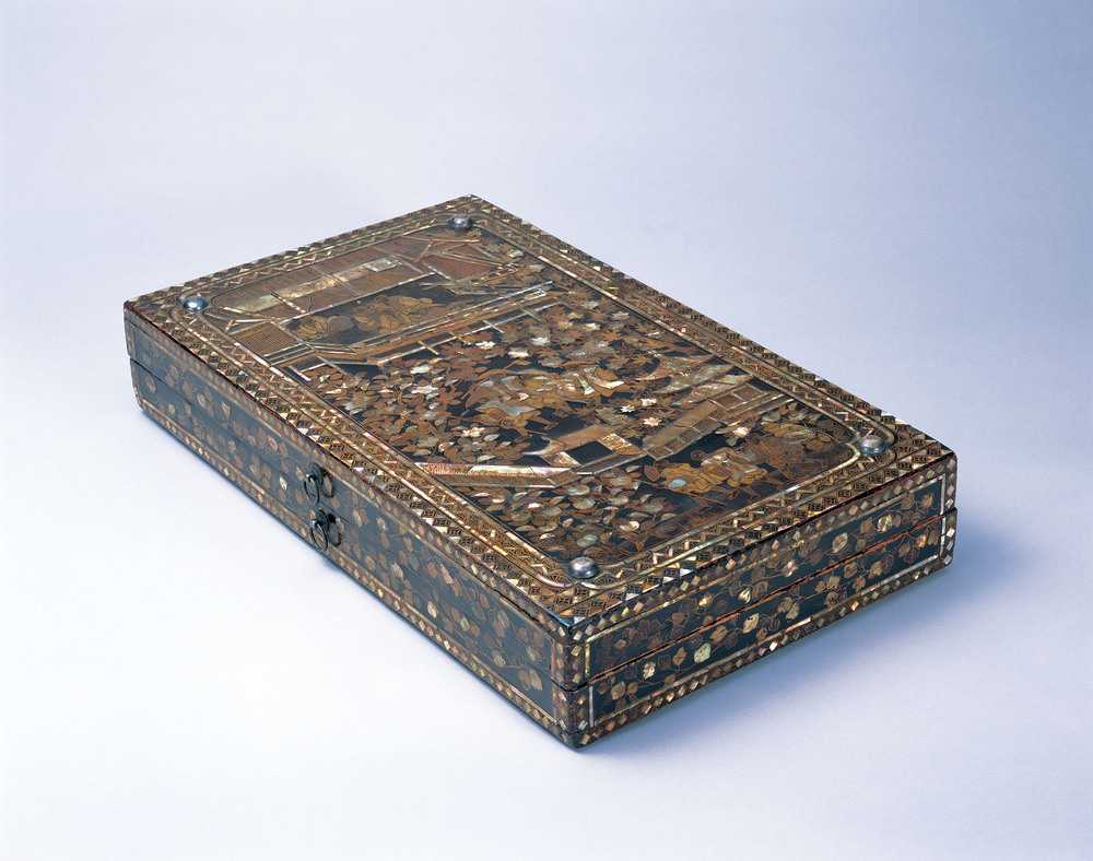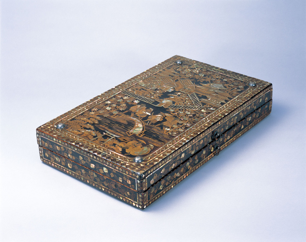 A backgammon board fashioned from two rectangular boxes joined with hinges. The interior features the gaming board with twelve points at top and bottom finished in red lacquer and motherof- pearl. The scenery at Kiyomizu-dera Temple and Sumiyoshi-taisha Shrine, complete with visitors, is rendered in gold hiramaki-e where the gold is sprinkled on the lacquer surface in very low relief, silver maki-e in the e-nashiji style of sprinkling coarse flakes over the whole surface, and inlaid with mother-of-pearl. Characteristically for Namban (Southern Barbarian) lacquerware, any gaps are filled with plant designs. This is a valuable object since it is in relatively good condition and there are few genuine examples of Western gaming boards among Namban lacquerware.