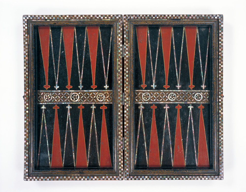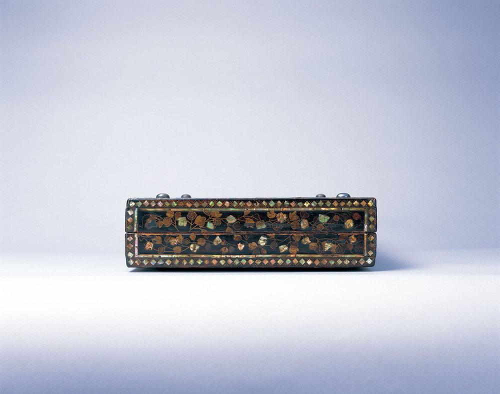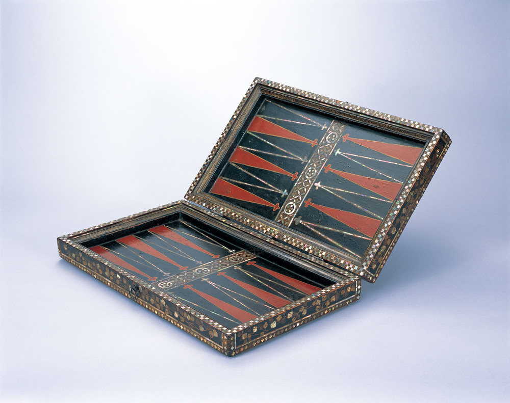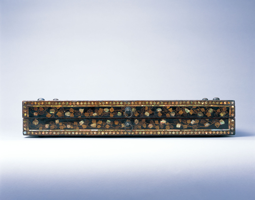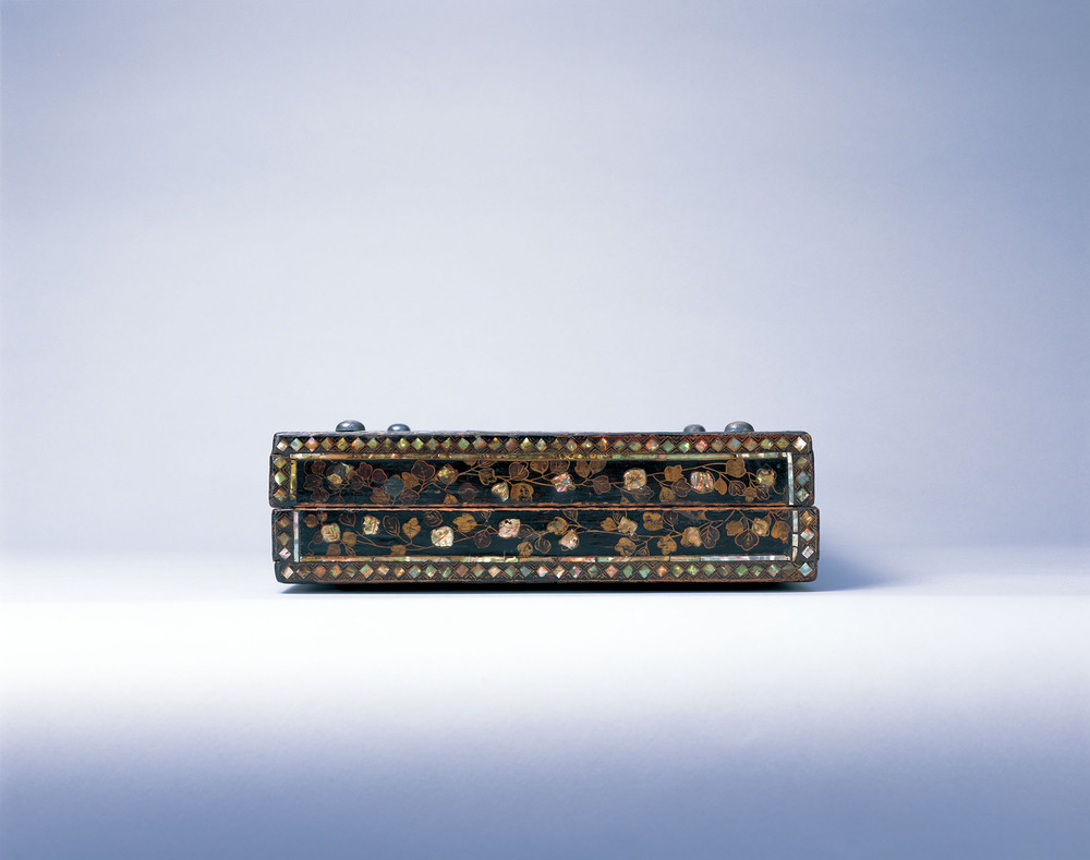 A backgammon board fashioned from two rectangular boxes joined with hinges. The interior features the gaming board with twelve points at top and bottom finished in red lacquer and motherof- pearl. The scenery at Kiyomizu-dera Temple and Sumiyoshi-taisha Shrine, complete with visitors, is rendered in gold hiramaki-e where the gold is sprinkled on the lacquer surface in very low relief, silver maki-e in the e-nashiji style of sprinkling coarse flakes over the whole surface, and inlaid with mother-of-pearl. Characteristically for Namban (Southern Barbarian) lacquerware, any gaps are filled with plant designs. This is a valuable object since it is in relatively good condition and there are few genuine examples of Western gaming boards among Namban lacquerware.