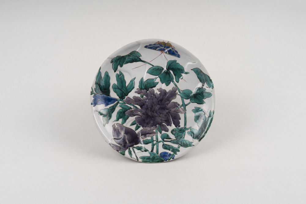 This thickly potted dish has a spiral flower motif impressed on the inner and outer sides of its outward-curving rim. A large peony flower and a butterfly in flight are placed on the interior. The flower is purple, the leaves green and blue. The butterfly is painted in blue, yellow, and red. The exterior is divided into sections as the spiral flower motif dictates, and is filled with green interlocking Buddhist swastikas, blue and red interlocking circles, and yellow, blue, purple, and white wave motifs. The inside of the foot has the character "fuku" (happiness) in black, over which green has been applied. This luxurious large dish has been decorated with exquisite care with a variety of motifs.
