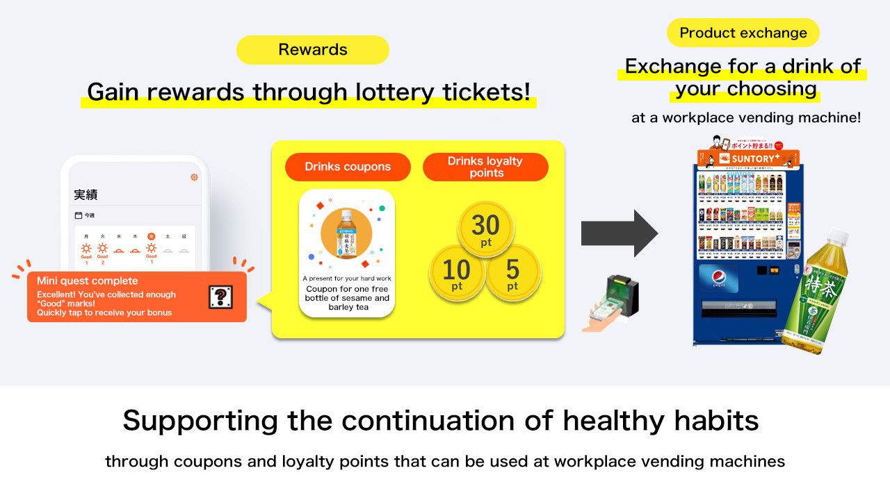 The app supports the continuation of healthy habits, too, with users who continue with their tasks receiving drinks coupons and loyalty points that can be exchanged for healthy drinks at vending machines.*2 Linking an app personalized to individual lifestyles with vending machines familiar to working people, and ultimately healthy drinks, SUNTORY+ is easy for anyone to use, and helps promote healthy habits in a natural way.*3