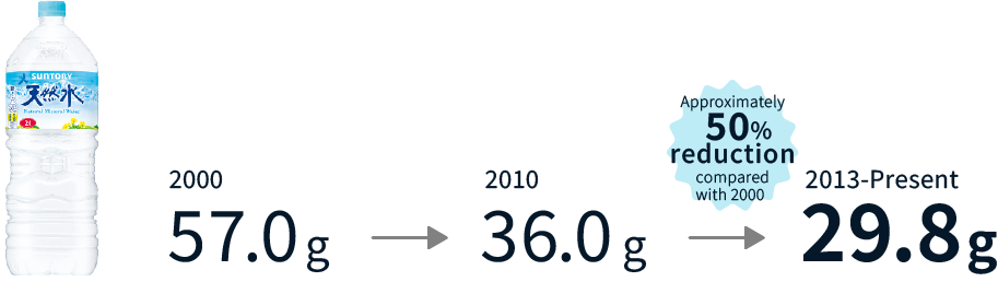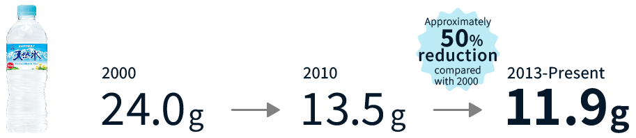 The 550ml Suntory Tennensui (Mineral Water) PET bottle (excluding products for vending machines) was developed by Suntory and is the lightest such bottle made in Japan* (11.9 g).