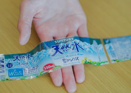 We are also working to reduce environmental impact by thinning the labels on PET bottle products. We achieved the thinnest PET bottle roll label in Japan at 16 ㎛*2 in 2012. We are using an even thinner label of 12 ㎛ for the 2L and 550ml PET bottles of Suntory Tennensui in 2014 and now use these labels on all our products with roll labels. This has allowed us to reduce CO2 emissions by 25%*3 compared to the conventional (16 ㎛) labels.