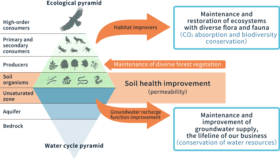 As a multifaceted beverages company, Suntory Group delivers the blessings of water and nature to customers through our products. Beautiful, clean water, plants and forests that grow in rich soil, rivers, oceans, and the air, and ecosystem services created by living creatures are the very foundation of Suntory Group's business. We recognize that safeguarding, carefully using, and circulating these gifts of nature is not only a crucial responsibility, but also a lifeline for business continuity.