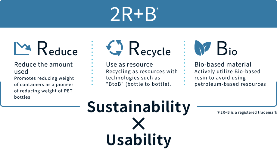 Based on Suntory Group's own 2R+B (Reduce, Recycle + Bio) strategy, we are working to thoroughly make effective use of resources by reducing resin use and using recycled or bio-based materials, while replacing petroleum-based materials with renewable ones.