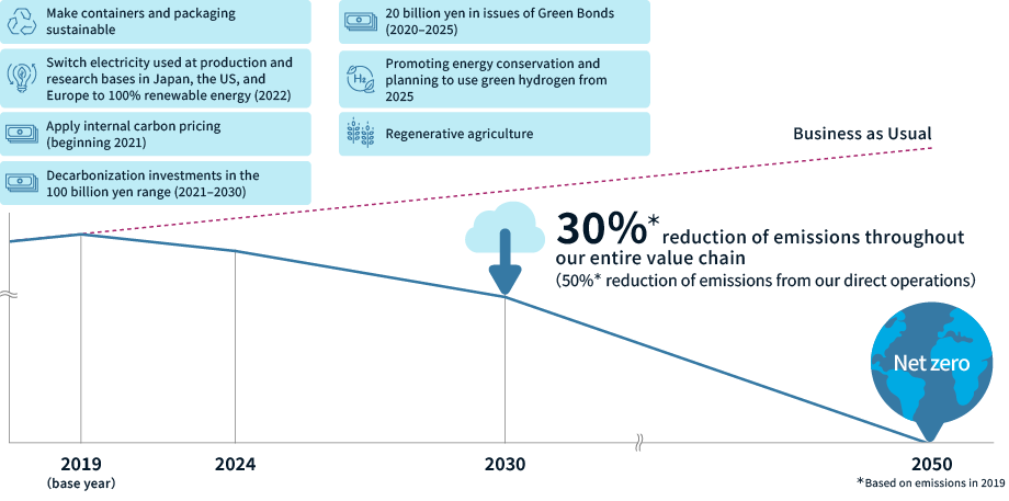 Suntory Group plans to invest 100 billion yen from 2021 to 2030 to promote decarbonization. These investments are expected to reduce GHG emissions by approximately 1 million tons in 2030.
