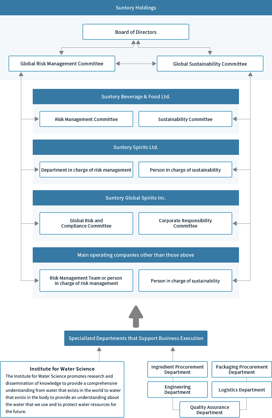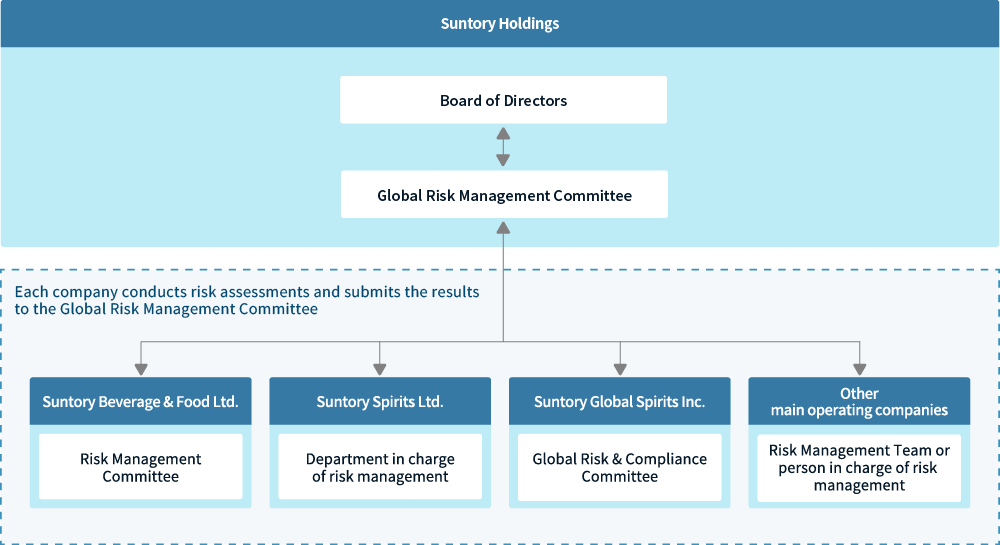 In response to the expansion of global business of the Group, Suntory Holdings established the Global Risk Management Committee (GRMC) for enterprise risk management (ERM), covering sustainability-related risks, in order to strengthen the risk management promotion framework for the entire Group including international Group companies. We also established the Global Sustainability Committee to discuss sustainability strategies and manage progress toward our goals.