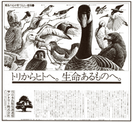 More than 50 years ago, in 1973, Suntory Group began its bird conservation activities with the slogan "Today Birds, Tomorrow Humans" (the happiness that comes to birds today may bring happiness to humans tomorrow). These activities seek to raise awareness of the environment through wild birds, which are said to be a barometer of the environment, and to pass on to future generations an environment in which birds, people, and all other living things can live in abundance.