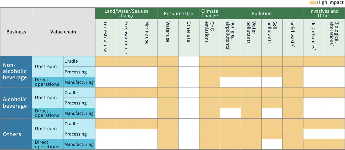 For direct operations, we classified and defined Suntory Group's key business activities to be assessed by selecting the economic activity classification of the International Standard Industrial Classification (ISIC) to which our business activities belong, and also used the Materiality Screening Tool (MST) developed by SBTN to gain an overview of the impact of our business activities on nature.