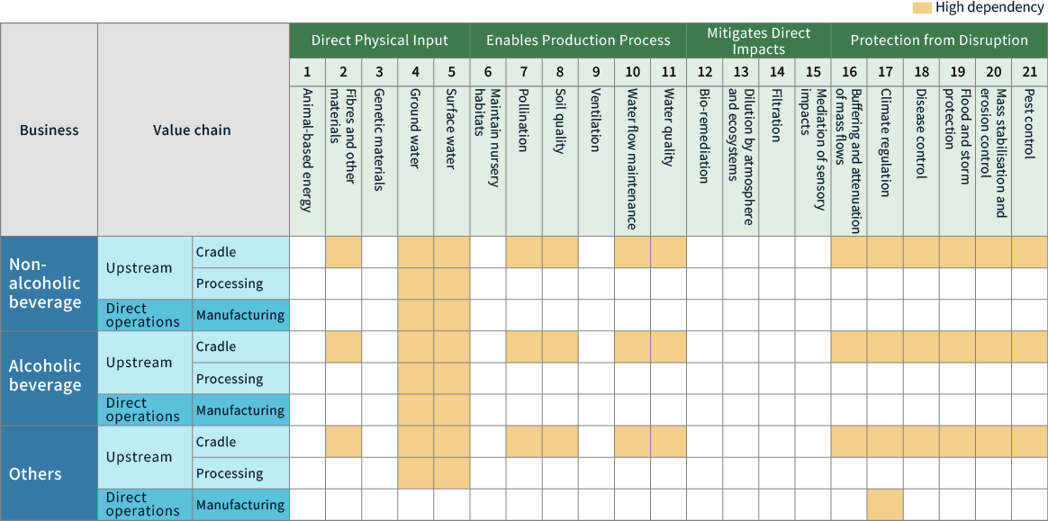 To further improve the accuracy of the assessment of the impacts and dependencies between our business and nature, Suntory Group has used tools and databases recommended by SBTN to clarify the pressure that Suntory Group exerts on nature and the ecosystem services on which its business depends.