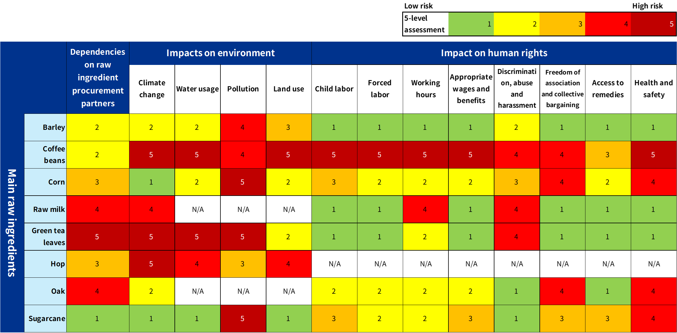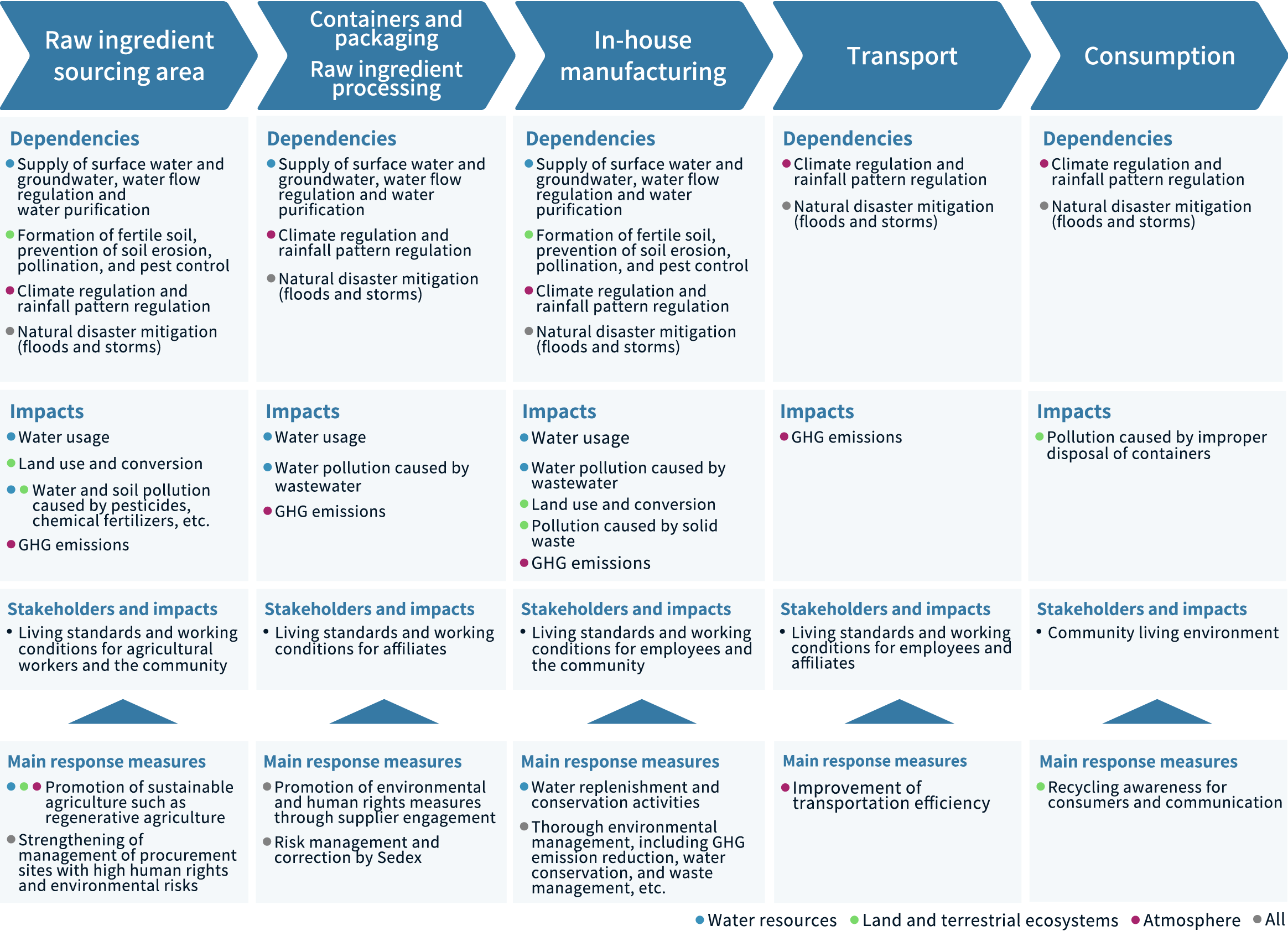 - With regard to nature, the assessment covers 79 directly operated production sites (27 in Japan and 52 outside of Japan), and the countries from which the 8 main raw ingredients are procured upstream in the value chain.