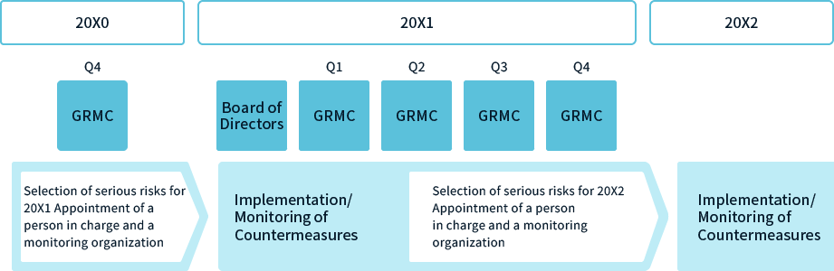For risks identified to require priority response, we appoint a person in charge and a monitoring organization and then implement measures to address the risks. The status of responses is reported and discussed at the Global Risk Management Committee (GRMC). Key risks for the next fiscal year are selected based on the results of the responses, followed by the PDCA cycle of identification, evaluation, countermeasures, and monitoring.