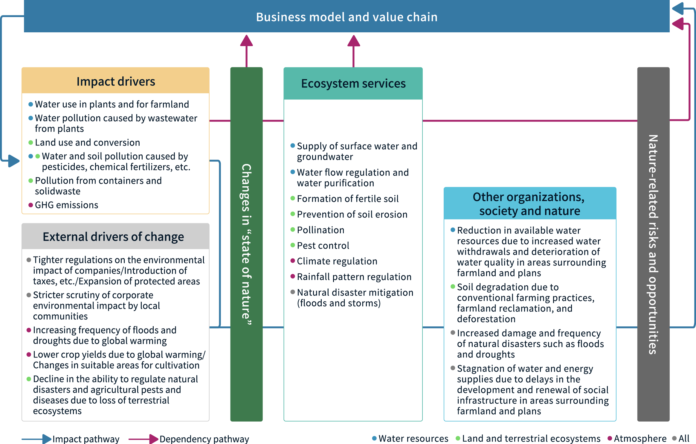 The diagram below summarizes the pathway relationships based on the above-mentioned impacts and dependencies on nature.