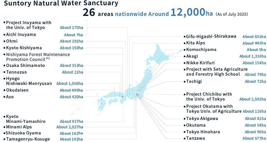 In 2003, the Suntory Natural Water Sanctuaries were launched in Kumamoto, Kyushu, with the aim of improving water replenishment functions and restoring biodiversity. They have since been expanded to cover an area of more than 12,000 hectares in 26 locations across 16 prefectures*, and are now conserving and restoring more than twice the amount of groundwater withdrawn by our plants in Japan. Currently, efforts to coexist with nature, such as water conservation activities, are expanding in various parts of the world where we do business.