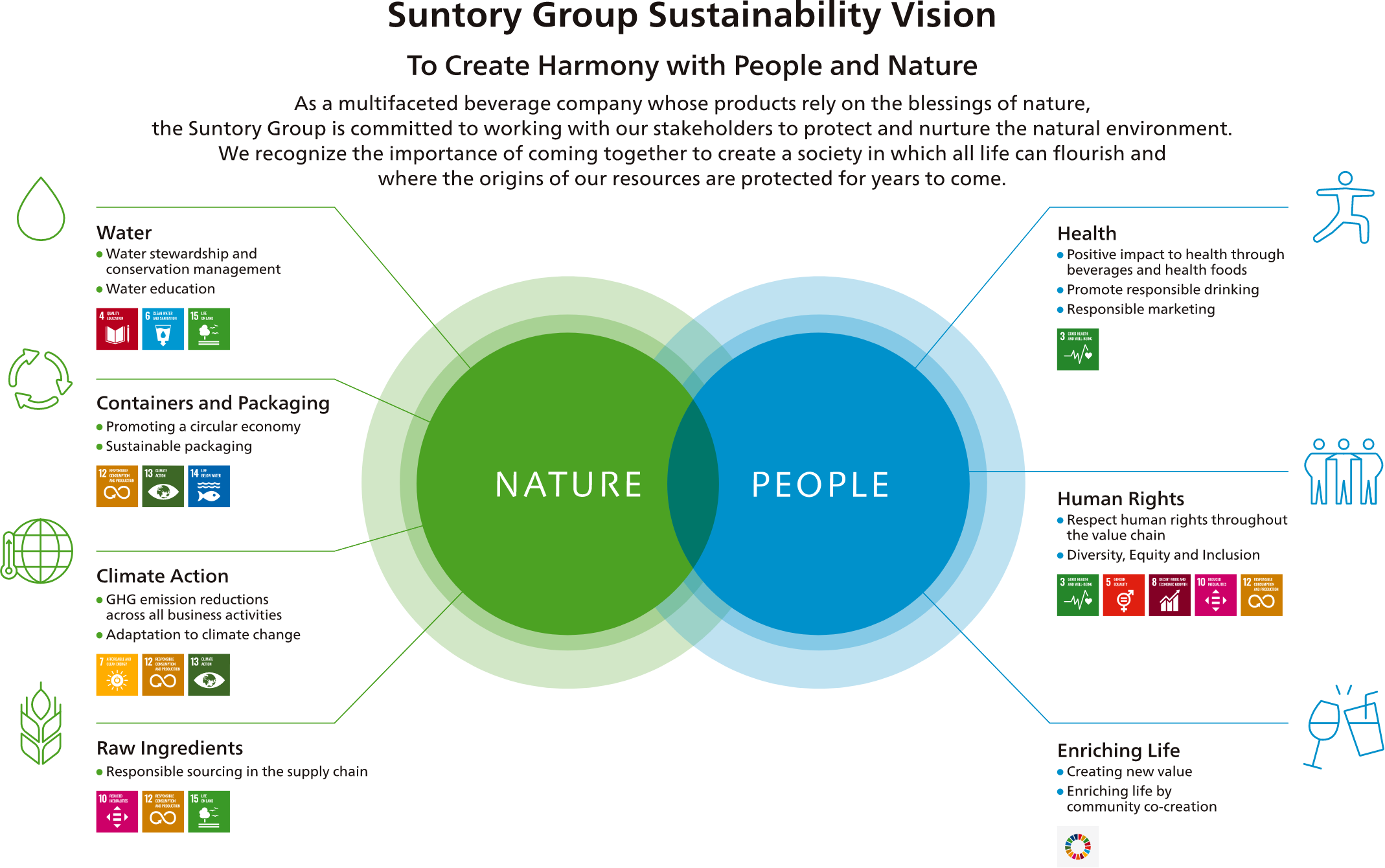 The 7 key themes in the Suntory Group Sustainability Vision consist of "Nature" (water, containers and packaging, climate action, and raw ingredients) and "People" (health, human rights, and lifestyle). Suntory Group is mindful of the interdependent relationship between "Nature" and "People," and is working with stakeholders to create a society in which both "Nature" and "People" resonate harmoniously.