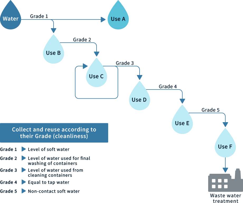 This technology involves classifying the water used in the manufacturing process (groundwater, river and lake water, rainwater, tap water, and externally supplied water (recycled water)) into five grades based on cleanliness such as cooling and cleaning. The water is then progressively reused from applications requiring higher grades to those that can be satisfied with lower grades.