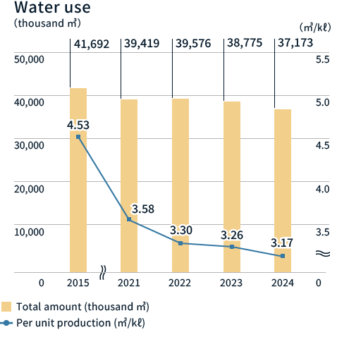 In Suntory Group's plants, water is used not only as an ingredient but also for cleaning and cooling manufacturing equipment. To conserve limited water resources, we implement the "3Rs of Water": reducing consumption (Reduce), using water repeatedly (Reuse), and treating it for repeated usage (Recycle). These efforts support our goal to “reduce water consumption at our owned plants worldwide by 35%”*