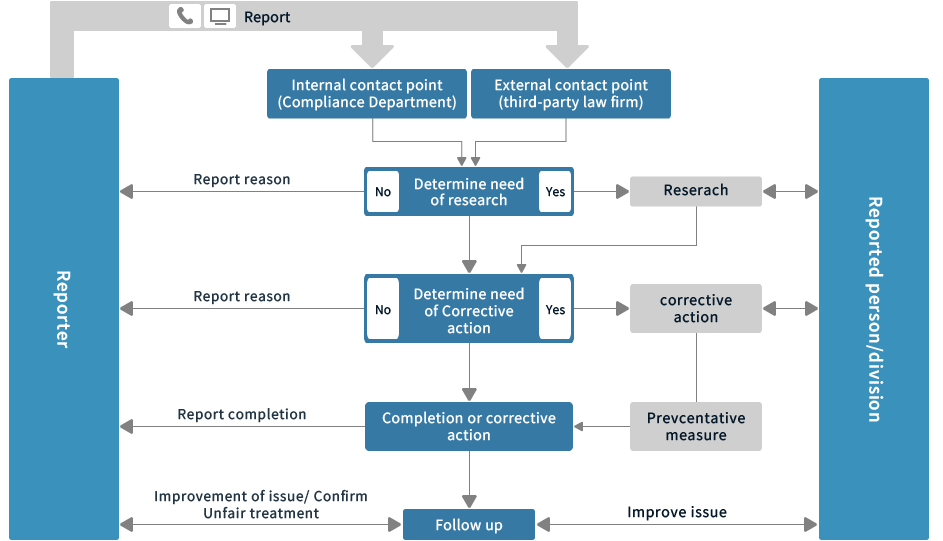 Moreover, we have put in place a global Compliance Hotline to create and utilize a system for receiving reports and carrying out consultations. Employees are encouraged to immediately report any instances of known or suspected corruption to the Compliance Hotline.